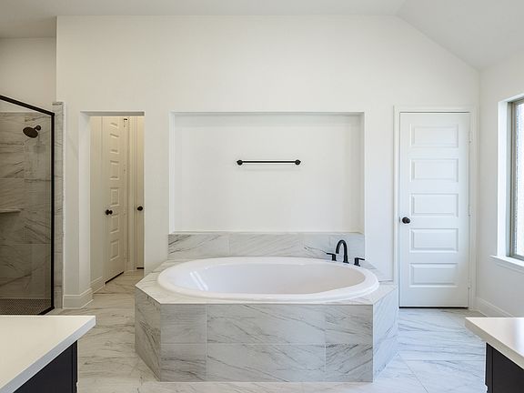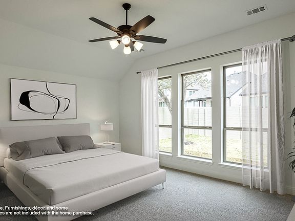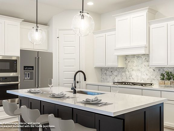 Extended entry with 13-foot ceiling leads to open kitchen, dining area and family room. Kitchen offers generous counter space, corner walk-in pantry, 5-burner gas cooktop and island with built-in seating space. Dining area flows into family room with wall of windows. Game room with French doors. Primary suite includes double-door entry to primary bath with dual vanities, garden tub, separate glass-enclosed shower and two walk-in closets. Secondary bedrooms feature walk-in closets. Covered backyard patio. Mud room off three-car garage. Representative Images. Features and specifications may vary by community.