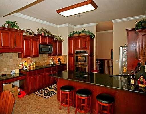 An awesome home with 2 living areas, 2 kitchens, 4 bedrooms and 3 1/2 baths. Downstairs could easily become a mother-in-law or guest quarters with 2 bedrooms, a full bath, kitchen, extra large living room, outside entrance plus an extra storage room. On the main floor living room there are soaring 20 foot tray ceilings, wood floors and a gas log fireplace. You will enjoy the well equipped kitchen with granite counters, cherry cabinets, double ovens, glass cook top. There is a formal dining room as well as a breakfast room. The master suite has his and hers closets along with a whirlpool tub.