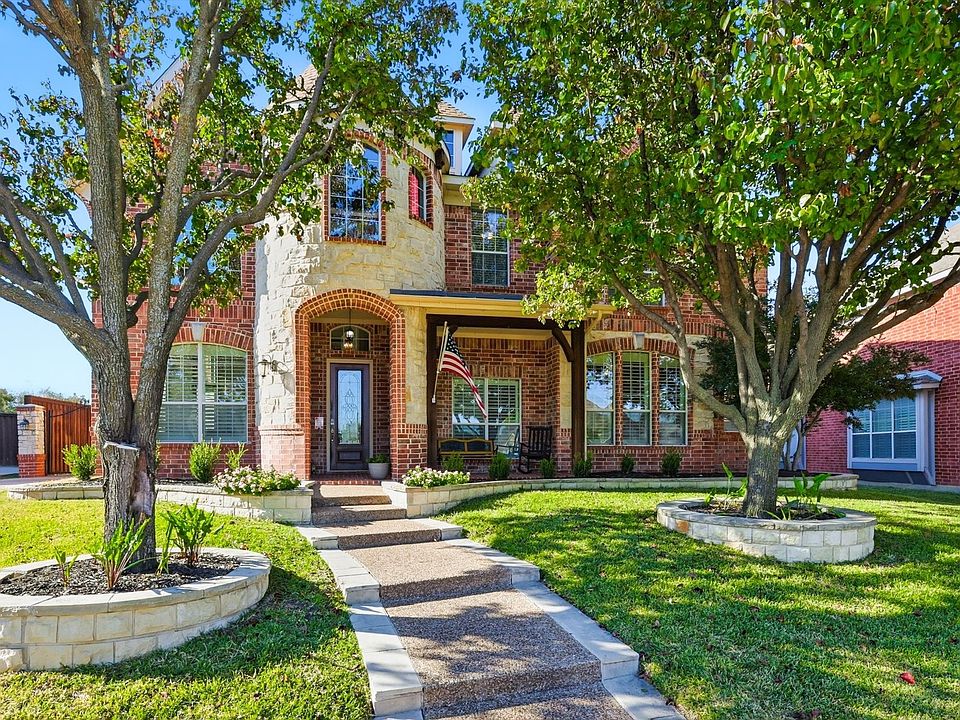 Welcome home to this stunning two-story residence in the highly sought-after Gentle Creek Estates community of Prosper. Built in 2005, this elegant brick and stone traditional spans approximately 4,382 sq ft on a spacious 0.34-acre lot. Step through the grand entry into a light-filled open floor plan featuring soaring ceilings, rich wood flooring, and plantation shutters. The formal dining room and adjacent living space flow seamlessly into a gourmet kitchen, complete with a massive center island, granite countertops, 42-inch cabinetry, stainless-steel appliances, a walk-in pantry, and a generous breakfast area. Relax in the spacious family room, anchored by a striking stone fireplace, or retreat upstairs to the impressive media room, wired for surround sound, with built-in bar seating ideal for movie nights and entertaining guests. Five generously sized bedrooms and four full baths offer comfort and versatility. The luxurious primary suite, located on the main level, features a spa-style bath and a spacious walk-in closet. Upstairs, the loft and additional bedrooms provide perfect space for a home office, playroom, or guest quarters. Outside, discover an entertainer’s dream yard with plenty of space to build your dream pool, complete with a gated entrance for added privacy and security. The covered patio and outdoor living area ensure year-round enjoyment. Located in the top-rated Prosper Independent School District, this home offers easy access to major roadways, shopping, dining, and recreation while preserving the peaceful, upscale lifestyle of Gentle Creek Estates.