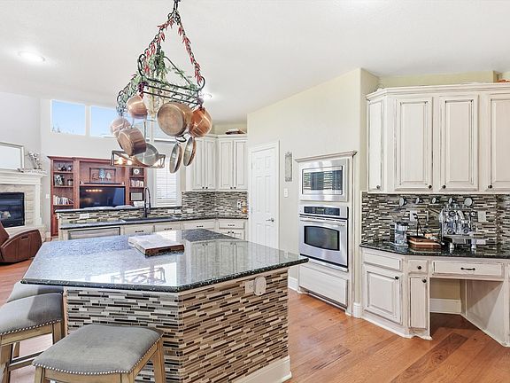 Striking stone fireplaceBuilt-in bar seatingStainless-steel appliancesRich wood flooringLight-filled open floor planSpacious family roomGranite countertops
