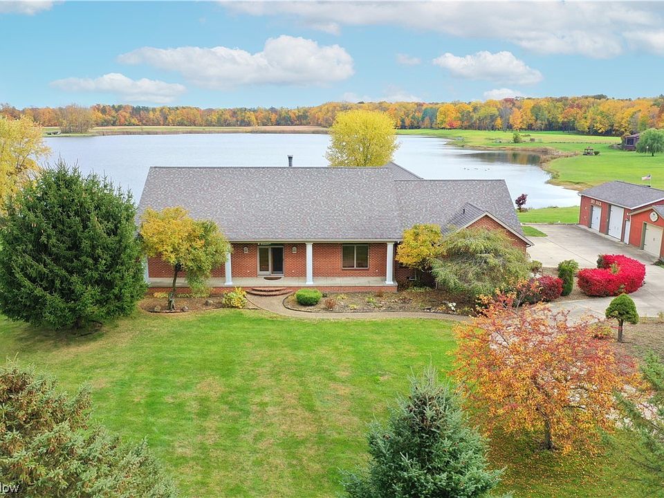 Rare opportunity to own a stunning custom built all brick ranch on Cowan Lake in Streetsboro. This beautiful setting features a sprawling brick ranch with 4 bedrooms, 3 kitchens, 3 car attached garage and 2 outbuildings (20x22 and 36x22). An In-law suite features a separate entrance, bedroom, full bath, living room, dining room, and kitchen. There are several options for a master bedroom with on-suite bath. Lower walkout level has a spacious media room, full kitchen, rec room, and a full bath for indoor/outdoor living beside a spacious heated inground pool overlooking Cowan Lake. A custom built waterfall, patio and firepit were added in 2021. New roof in 2020 and new furnace and heat pump in 2022. Basement is 12 courses of block waiting for your own custom finishing touches, and a spacious work area for working on all your projects.