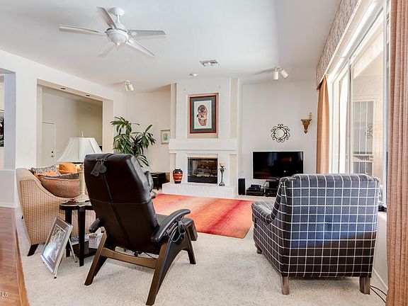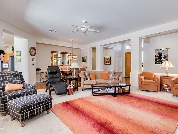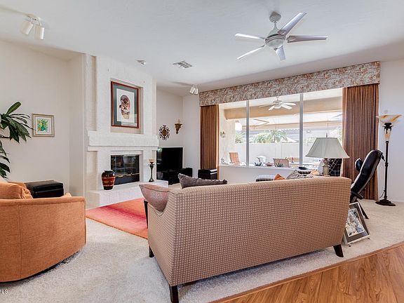 Beautiful ''CARMEL'' Great Room Home located on an interior lot w/ SOUTH EXP. PRIVATE SETTING on your EXT'D, STAMPED CONCRETE Patio, Raised Flower Bed Bordering Kitchen window adds Perfect Touch. Exterior painted Fall 2016. Inside a NEUTRAL PALETTE awaits w/ combination of high-quality laminate & carpet, higher baseboards & Plantations Shutters thru-out. Gas Fireplace centered on Great Room Wall. Kitchen has recessed lighting, Newer Arcadia Low-e Dble Pane Door & SS Refrig. Master Bath has Crown Molding, updated shower & vanity w/ heated tile floor & CA closet. Maintained home w/ updated Duct work, Drip System, RO System & Soft Water system. 3rd Car bay has own A/C & work area. Enjoy the Westbrook lifestyle- (see more) with TWO PGA Golf Courses, ProShops & Restaurants, Work Out Facility, Pickle Ball,Tennis and Numerous Art, Theatre, Card Clubs. PLUS proximity to Loop 101 and Shopping, Restaurants, Theatre and Sporting Events. Welcome Home