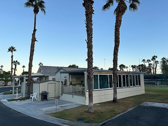 Beautifully maintained park model home in the desirable 55+ Rancho Casa Blanca Resort in Indio. Space 187 is a prime location across from the main clubhouse, with a practice putting and chipping green virtually in your back yard. Fully equipped outdoor kitchen on a spacious 16' x 12' deck, with BBQ, fridge, sink & dishwasher. The home features a living room, large family room, queen bedroom, washer/dryer, and a new 2-ton AC/heat pump. Inside, this home offers one of the largest additions in the park, recently expanded for added comfort and flexibility. The spacious living room includes a 55” TV, two recliners, a sofa bed and dining table seating 6—ideal for hosting guests. The bedroom features a cozy queen bed, and there’s ample indoor storage throughout. It also has an 8' x 10' storage shed and and lots of green space between you and your next door neighbor, which makes it one of the most desirable lots in the park.