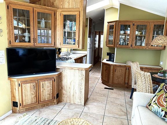 This updated 1992 Park Model has many improvements. The furniture is New, light fixtures have been updated, new ceiling fa, handles and pulss on cabinetry have been changed. New Refrigerator and Range. A New Mattress. Larger bathroom than most Park Models, Washer/Dryer in shed and a Dishwasher in the kitchen. If you lift up the bed and it turns into large desk, perfect for someone who needs to work from home.