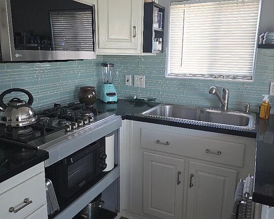 Quartz countertops in kitchenNew kitchen appliancesOutside deckWeatherproof deck flooring