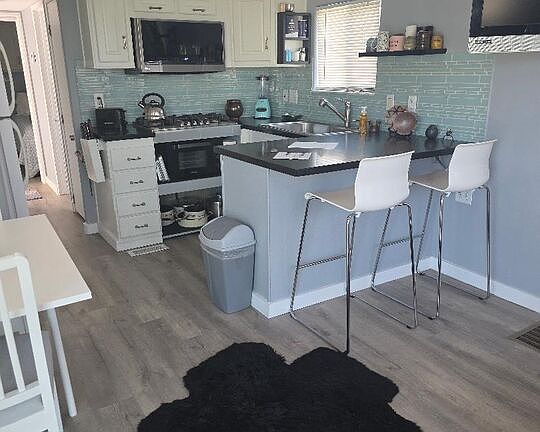 This Park Model, with an oversized loft has been recently upgraded with paint throughout, Quartz counter tops in kitchen and bathroom and flooring throughout. The new kitchen appliances include: 5 burner range top, combo microware/convection and hot air fryer. It has a New living room glass slider, hot water heater and HVAC. The outside deck has new steps up to the weatherproof deck flooring. This is a turnkey at it's finest. This all located in a 55 community that has a 3 par golf course, chipping green, putting green, 9 hole mini golf, pickleball and tennis courts, bocce ball, an indoor shuffleboard courts, 2 clubhouses with pools and Jacuzzies and an additional 4 satellites with pool, jacuzzi and mail boxes. This is all within a 24 hour gate guarded community ,of 801 lots, that consist of a combination of Park Models and RV lots, where you own the land. The resort has a limit of 270 day occupancy. It is. a perfect place to spend your holidays in the sunshine.