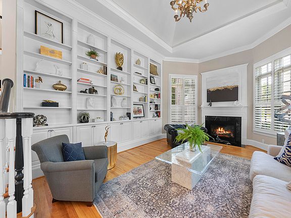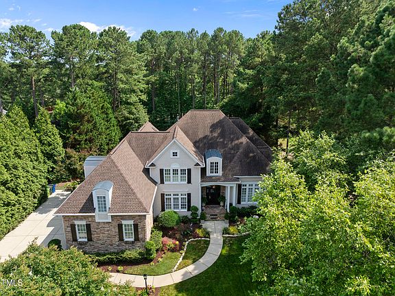 Welcome to 8416 Davishire Drive, a beautifully appointed home in the highly desirable Traemoor Manor community of Raleigh. Set on a professionally landscaped, .73-acre lot with a fully fenced backyard, this luxurious residence offers 4 bedrooms, 3.5 baths, over 5,200 square feet, and a 3-car garage equipped with a 250V hybrid vehicle plug-in. Step inside to a dramatic two-story foyer that sets the tone for the custom details found throughout. The main level features gorgeous hardwood floors, custom plantation shutters, built-in audio and Minka Aire ceiling fans (except for in the sunroom). The cathedral-ceiling study offers a quiet, inspiring workspace with a floor-to-ceiling wall of built-ins and a cozy fireplace. At the heart of the home is the expansive family room with soaring 18-foot ceilings, a second fireplace with custom built-ins, and large windows that bring in natural light. Just off the family room, the light-filled sunroom features radiant heated floors and automated skylights, creating a comfortable retreat year-round. The gourmet kitchen is both elegant and functional, equipped with Fisher & Paykel upper and lower pull-out dishwashers, a JennAir French door refrigerator with in-door water, GE Profile double ovens, a GE Monogram 5-burner downdraft gas cooktop, under-cabinet lighting, and a butler's pantry with wet bar, wine racks, and glass display cabinetry. Wine enthusiasts will appreciate the temperature-controlled 300-bottle wine cellar with teak racks and its own dedicated HVAC unit. The first-floor owner's suite is a private retreat with a tray ceiling, sconce reading lights, and a spa-like bath featuring a Victoria + Albert freestanding tub, large tile-surround shower with semi-frameless glass, and dual vanities. Upstairs offers a spacious bonus room, three additional bedrooms—one with a private en-suite and two that share a Jack and Jill bath—and a floored walk-up attic for future expansion or storage. Additional highlights include a tankless water heater, irrigation system, sealed and conditioned walk-in crawl space, and a custom Renaissance pergola in the backyard that adds both charm and function.