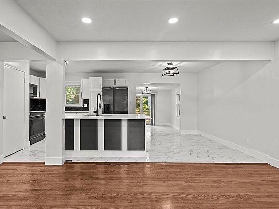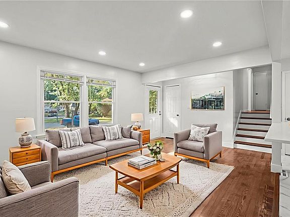 Beautifully redone side-to-side split with an open floor plan and sophisticated finishes throughout! The main living area flows effortlessly between the spacious living room and the stylish black-and-white kitchen, complete with a large island, ample cabinet storage, gleaming quartz countertops, and all new dark stainless steel appliances. The dining room opens up to the back patio and yard, making it easy to enjoy dinner indoors or al fresco. The primary bedroom has a private ensuite half-bath, and a large full bath with a double vanity and spacious shower plus two more bedrooms complete the bedroom level. Downstairs, the spacious unfinished basement is clean and painted so you can easily create additional living space with some rugs, furniture or a game table, or enjoy having plenty of clean and dry storage. Convenient location close to parks, schools, highway access and more. Welcome home!