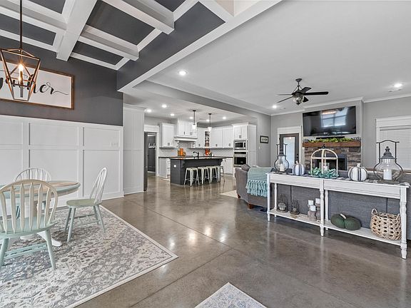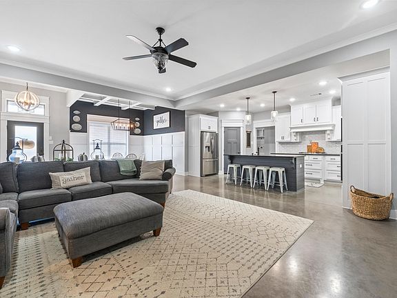 Built in 2018, this home features a functional split floor plan with an open concept living area, high ceilings, and a gas log fireplace. The kitchen, dining, and living spaces flow together for easy everyday living and entertaining. The primary bedroom includes a tray ceiling and an en-suite bath with separate vanities, a walk-in shower, and a soaking tub. The large primary closet connects directly to the laundry room for added convenience. Outside, enjoy a covered back porch overlooking the fenced yard. The property also offers a side-load garage and a freestanding storm shelter located in the garage.