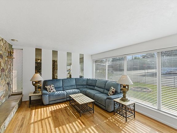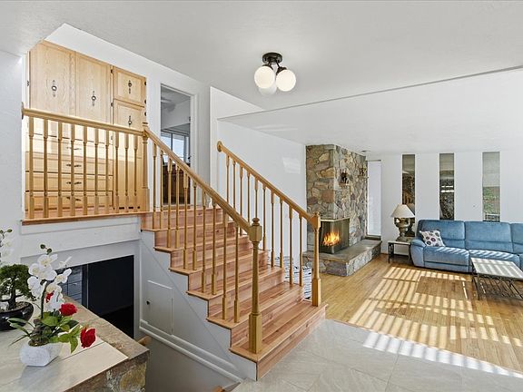 This beautiful, charming home offers open, spacious design. Stunning floor to ceiling windows fill space with natural light. Exceptional family room boasts fabulous stone fireplace and hardwood flooring. Wonderful kitchen includes upgraded cabinetry, granite counters, newer appliances and excellent workspace. Upstairs features a primary suite with double closets and private deck, a second bedroom and spacious bathroom. Walk out basement offers Inviting second family room, bedroom including rock fireplace, convenient laundry room, abundant storage. Newer membrane roof and new sewer main to the street. Property has private outside entrance to lower level. Splendid yard showcases covered patio, mature trees and garden area. Oversized garage and impressive RV parking. This gem is a real treasure!