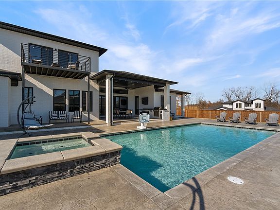 Stunning home in Scissortail Subdivision! This home offers charm, custom design, and thoughtful details throughout. The kitchen is a masterpiece with endless built-ins, an oversize quartz waterfall island, 8-burner gas range, and fully equipped spice kitchen with custom appliances. Large walk-in storage pantry. The Primary Suite stuns with dual-sided fireplace shared with bathroom. Massive 3-tier closet. Spacious shower, heated bathroom floors. Two additional bedrooms and office on the main level. Upstairs features three bedrooms with ensuite bathrooms, and a media room with built-in wet bar, mini-fridge, and surround sound perfect for entertaining! Extra insulation to save energy. Enjoy the outdoor with a built-in grill on large, covered Patio. Custom built large in-ground salt pool, hot tub and fire pit with seating in backyard--perfect to host get togethers. Built in speakers throughout.