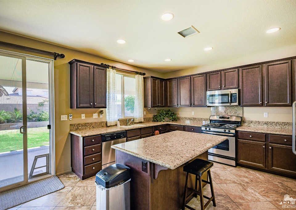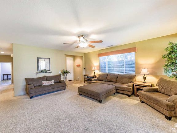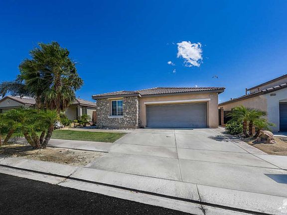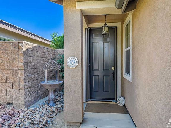 Beautiful decorative stack stone facing out front creates a great first impression of this highly functional 4 bedroom home. The patio here has a partial view of the Santa Rosa Mountains where the Southern sunsets and lingering twilight skies can be spectacular. Inside you will find beautiful tiled floors, plush carpet, custom window treatments, lighted ceiling fans and recessed lighting that blend to create a comfortable move-in-ready look & feel. There are gorgeous granite counters in the kitchen as well as stainless steel appliances, a prep. island, quality cabinets and views of the backyard and beyond. The king sized master suite has dual vanities, an oval tub, separate glass enclosed shower and a generous walk-in closet. The three additional bedrooms is a luxury. A covered patio runs the width of the home. There is green grass and a block wall privacy enclosure. The 2 car attached garage has overhead storage. This house feels like a home!