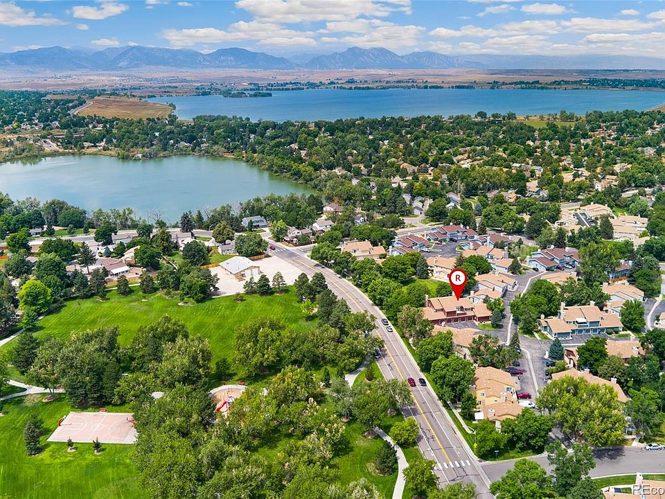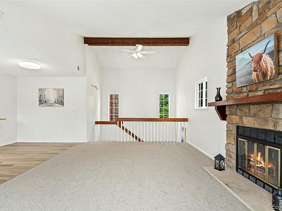 Bright, sunny, and move-in ready—this Timbercove II townhome-style condo offers all the convenience of single-level living with elevated charm. Enter through a welcoming foyer with access to a one-car attached garage and additional storage closet. Head upstairs to discover an open and airy living space filled with natural light, soaring vaulted ceilings, and a striking floor-to-ceiling stone fireplace. The dining area and kitchen feature luxurious vinyl plank flooring, a breakfast bar, and a cozy dining nook, all leading to a spacious private balcony—perfect for relaxing or entertaining. The primary bedroom also opens to the balcony and includes dual closets and a handy Murphy bed. A secondary bedroom offers a generous walk-in closet, and both bedrooms include LVP flooring and ceiling fans for added comfort. The full bathroom and convenient in-unit laundry complete the home’s functional layout. Enjoy peaceful surroundings, with walking paths and Arvada Volunteer Firefighters Park just across the street—featuring a large playground, basketball court, and open space. Just minutes from Standley Lake, shopping, and dining, this is a wonderful opportunity to own a well-kept, light-filled home in a prime Arvada location.