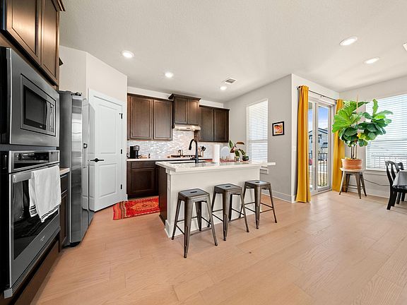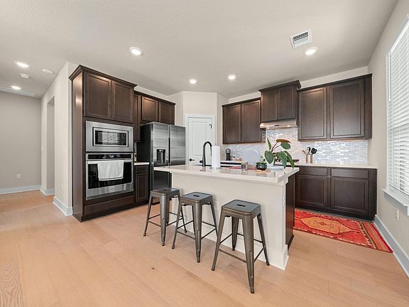 Blonde engineered wood floorsCorner-lot homeQuartz countertopsSpacious kitchenOpen and airy layoutDark wood cabinetryLarge secondary bedrooms