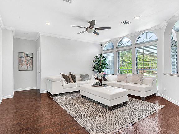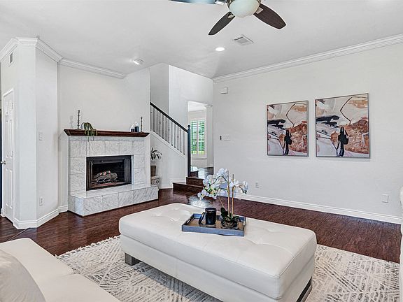 This immaculate, light, bright, and beautifully updated home offers 2,677 square feet of thoughtfully designed living space. Located in a desirable Rowlett neighborhood, this property blends modern comfort with charming character and exceptional functionality. This spacious property features wood laminate flooring throughout—no carpet! High ceilings and abundant natural light create an open and airy feel. The large front living area with built-ins is ideal for a home office. The eat-in kitchen boasts granite countertops, a large island, stainless steel appliances, pot rack, 5-burner gas cooktop, and generous cabinetry. The oversized laundry room offers ample storage and a laundry chute for convenience. The primary suite includes a sitting area, patio access, a wall of windows, garden tub, double sinks, frameless shower, marble flooring, and a custom designed walk-in closet. Upstairs includes a flexible game room with French doors and a walk-in closet—perfect as an optional 5th bedroom. All secondary bedrooms feature high ceilings and great natural light. Updated bathrooms with marble flooring. Parking is exceptional with a 2-car garage and room for 4 more vehicles, a boat, or RV. The backyard is an open canvas, and it includes a wrought iron fence, patio, grapevines, plum tree, crepe myrtles, and more. Roof will be replaced prior to closing. Conveniently located about 2 miles from Lake Ray Hubbard and Paddle Point Park & Launch and close to scenic nature trails, parks, Waterview Golf Club, as well as a variety of restaurants, grocery stores, fitness gyms, nightlife, and shopping. Quick access to President George Bush Turnpike and I-30 and it is 25 minutes to downtown Dallas.