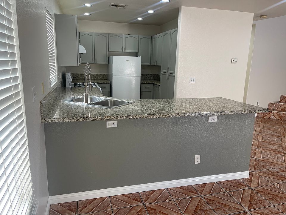 The modern kitchen features sleek gray cabinets and beautiful granite countertops that extend to a breakfast bar.. Stove & Refrigerator included! Washer and Dryer hookups. (washer and dryer NOT included)