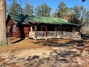 This log cabin home is located in the country in a wooded area. MUST SEE THIS ONE! Fireplace! Vaulted ceiling in living room! Special amenities in kitchen! Pot filler! Farmhouse apron front sink! Under cabinet lighting! Large great room! New flooring throughout. Fresh paint! Relax on the front porch and listen to the birds! Beautiful yard with many blooming shrubs and bushes! 30 X 50 SHED with kitchenette and bathroom! Venue! Rent the shed out for graduation gatherings...birthday parties... POND! Fish from your own pond! 2nd shed for extra storage. You will love the big outdoor space! Must see to fully appreciate!