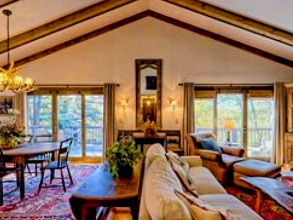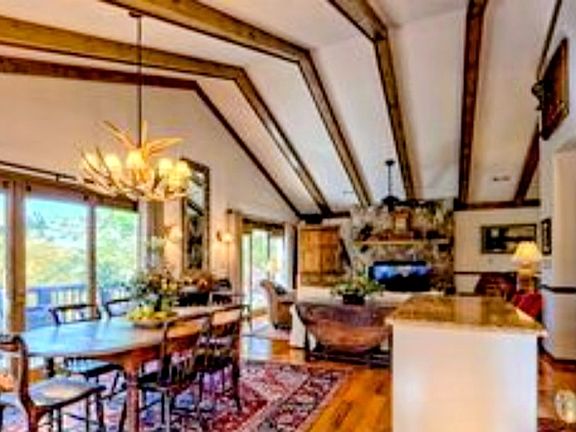 Magnificent rock fireplaceLovely viewBack decksRefreshing cool summersBright open dining areaNumerous windowsFamily room