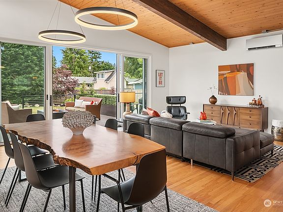 Built w/exceptional design & attention to detail as a contractors personal residence. Mid-century style one level home has soaring wood slat ceilings & grand wall of windows filling it w/natural light. Thoughtful layout w/3 bdrms & 2 bths on the east side, featuring a luxurious primary suite. The center is the heart of the home w/open living & dining area & magnificent kitchen w/high-end appliances & sleek walnut cabinets. Stunning glass doors open to huge yard & deck, perfect space to relax & entertain. West wing has a spacious rec-room, 4th bdrm & ¾ bath. 2 car attached garage, lrg detached shop/garage & rv prkng w/hookup. Minutes to DT Edmonds shops, restaurants, beach, parks, easy access to freeway & transportation. You'll fall in love!
