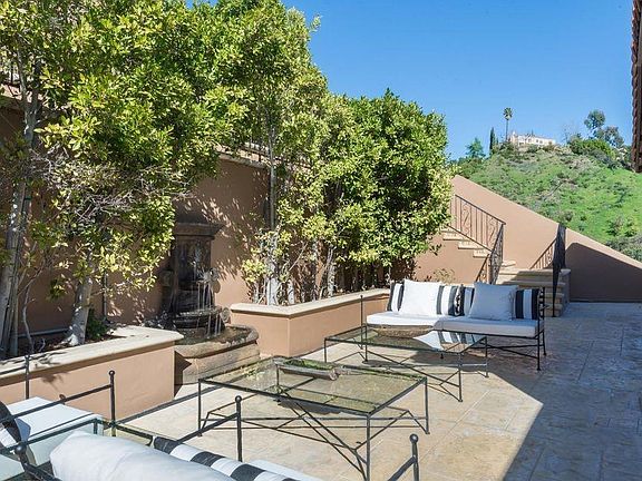 Gated Beverly Hills villa located on a quiet cul-de-sac street. Gracious and elegant, this 5 bedroom 7 bath estate boasts a grand entry with beautiful curved staircase. The interior space showcases incredible volume & scale, high ceilings, & mahogany hardwood floors throughout. The main level consists of formal living and dining, a gourmet chef's kitchen with a generous center island, walk-in pantry, breakfast room, & spacious family room with fireplace, & French doors leading to a resort style pool & spa. On the second floor are 3 ensuite bedrooms along with an impressive master suite featuring a fireplace, romantic balcony, and a sunny bathroom with spa tub, separate shower, vanity, and patio. The lower level is complete with a 5th ensuite bedroom, and media Room; perfect for entertaining. Beyond the pool, the hillside is a paradise of privacy with mountain/city views, terraced patios, fountains, and private courtyard's for lounging and dining. 2 car garage and ample parking. Owner will pay utilities