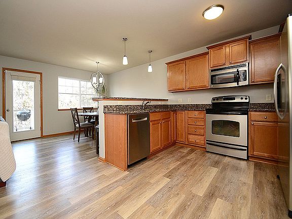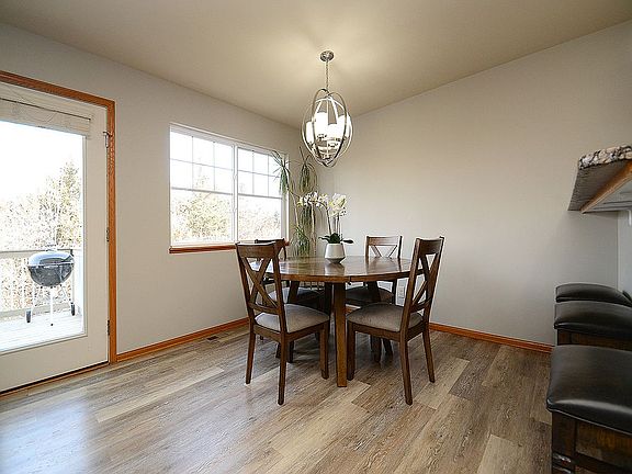 Meticulously maintained 2 story townhome with walkout basement backing to trees. Over 2400 sq ft of finished space. Open floorplan with vinyl plank floors. Kitchen features granite countertops, stainless steel appliances and huge walk-in pantry. 2 floor features 3 bedrooms including a very spacious primary suite with private bath and walk-in closet. Finished walkout basement with new carpet, 4th bedroom, living room with cozy electric fireplace plus a 4th bath area. The view of the treelined acreage to the back can be enjoyed from the main level deck or the covered patio below. HOA takes care of snow removal, lawn care, exterior water, and garbage service.