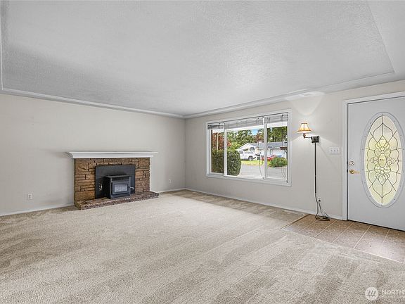 Welcome home to your charming 1,000 sq ft rambler! This well-maintained home features generously sized rooms, abundant natural light, & original character including a step-up ceiling & stone fireplace with pellet stove. The spacious kitchen & large laundry room offer comfort, with brand new carpet adding a fresh touch throughout. Amazing high-efficiency heat pump for heating & cooling to keep utility costs low year-round, & the roof still in the first half of its life. Step outside to a fully fenced backyard, perfect for entertaining, complete with a patio, garden space, a storage shed & plenty of parking. All appliances stay for a truly move-in-ready experience. Conveniently located near JBLM, I-5, Lakewood Town Center, schools, and more!
