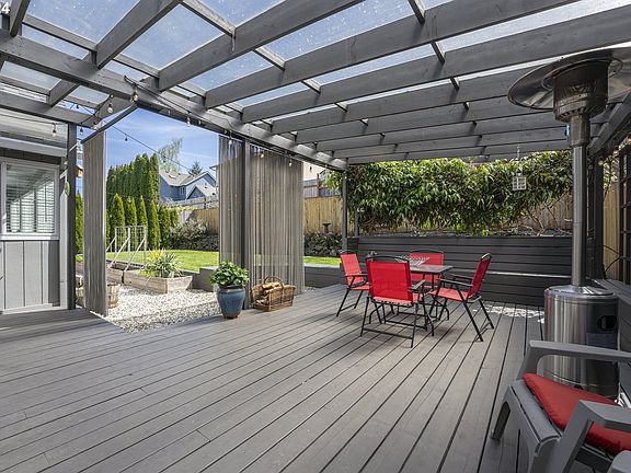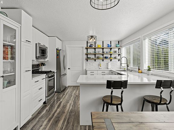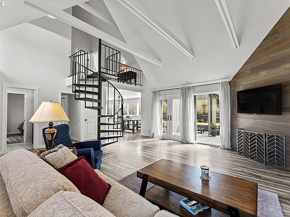 Soaring Beamed Ceiling and tall windows allow natural light to flood the updated open floor plan. Watch backyard activities from the fully equipped kitchen with quartz counters, stainless Energy Star appliances, a gas range, cabinets with a pull-out pantry, and soft-close drawers. Are you a fan of farm-to-table dining? Grow your own vegetables in raised garden beds and enjoy dinner served on the private, covered deck alongside a crackling fire, then end with a relaxing hot tub experience.One bedroom and a full bathroom are located on the main level; two additional bedrooms, a full bathroom, and a loft are upstairs. The primary bedroom has a huge walk-in closet with added storage. Easy care laminate floors throughout. New Furnace and A/C in 2019. Follow the paved neighborhood path to elementary and high school. It is an ideal location with easy access to Bridgeport Village, freeways, parks, restaurants, and so many shopping options.