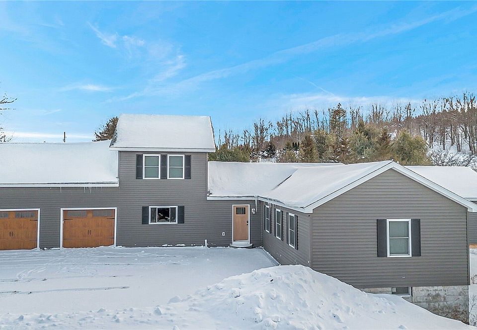 Discover this charming residence situated on almost 3 acs of serene landscape, featuring a large apple orchard, offering a peaceful retreat. This spacious property features a well-designed layout across 3 floors, perfect for both relaxation & entertaining. A paved driveway & stamped concrete patio welcome you at the entry, setting the tone for the quality found throughout the home. Upon entering the second floor, you're welcomed into an open-concept living area adorned with hickory hardwood flooring that seamlessly blends the living, dining, & kitchen spaces. The kitchen features Amish-built cabinetry and hickory hardwood island, quartz countertops, and a double oven, making it ideal for both everyday cooking & hosting. This level also includes the primary suite, complete with an en-suite full bath & a spacious walk-in closet. Two additional large bedrooms on this floor provide flexible living arrangements for family or guests. A bonus room adds versatility, suitable for an office, reading nook, or extra storage. Descending to the first floor, you'll find a large recreation room, offering flexibility for various activities, from family gatherings to game nights. This level includes a full bath for convenience, a large utility room with laundry, two dedicated storage rooms, and direct access to the outside for easy movement in & out of the home. The third floor, also enhanced with hickory hardwood flooring, is dedicated to a large private suite featuring a half bath and ample closet space—an ideal retreat for guests or a secluded personal getaway. This property also includes an Amish-built shed, and the addition offers heated floors & is equipped with underneath lighting for a future covered outdoor retreat, enhancing the functionality a& potential of the outdoor space. The surrounding natural beauty—including the orchard—enhances the overall tranquility, making this a delightful escape. This home offers a wonderful opportunity for comfortable living & is ready for your personal touch—all just minutes from everything the Village of Ellicottville and its renowned ski resorts have to offer. Sq. ft. does not match the county records, is based off agent measurements