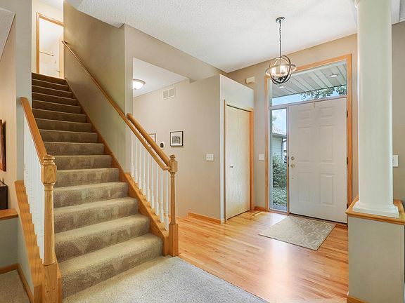 Modified 2-story floor plan offers a spacious Great Room w/gas fireplace, tile surround & built-ins. Large Kitchen w/center island, bar area with glass-front cabinets, and open informal dining room. Real hardwood floors, tiled baths & laundry. The BEST room in the house is the amazing heated 4-Season Porch-it's like a sanctuary for relaxation w/multiple windows to let nature in. Paver patio & natural gas grill (included). Semi-private yard with mature trees w/flower perennial gardens and organic vegetable garden. Three bedrooms upstairs, 4th Bedroom/Office on the main level with walk-in closet. Owner's Suite with tray vault, walk-in closet, and full bath with dual vanities, shower, and extra deep soaking tub. New carpet in large lower level Family Rm, unfinished storage area and rough-in for additional bath. 240-Volt outlet for Level 2 Electric Vehicle charger. New Air Conditioner May 2023. New Roof July 2021. Paved trail system accessed from the cul-de-sac, just steps away!