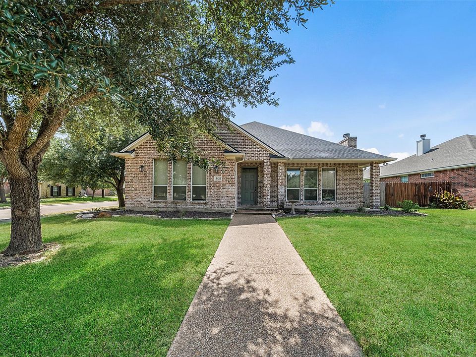 This charming brick home sits on a corner lot and welcomes you with a covered front porch and country-style screen door. Step inside to a spacious living area featuring a cozy fireplace accent wall and abundant natural light streaming through large windows. The kitchen offers granite countertops, under-cabinet lighting, wood cabinetry, and a breakfast bar, with the laundry room conveniently located nearby. Tile flooring flows throughout the main living spaces, while the split-bedroom layout includes brand-new carpet in the bedrooms. The versatile extra room is ideal for a home office or playroom. Enjoy a nice-sized backyard, a side-entry two-car garage, and a prime location close to shopping and Hwy 6 for easy commuting.