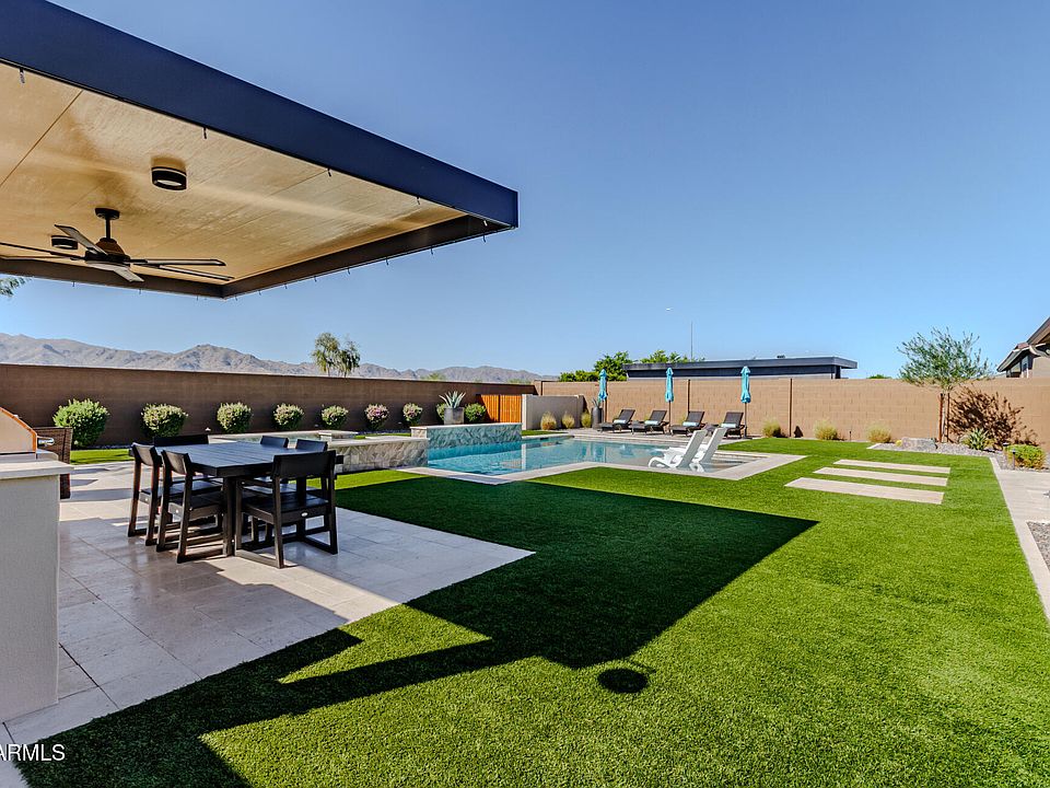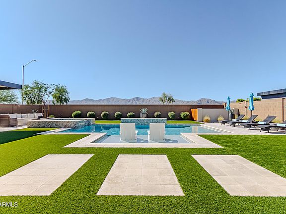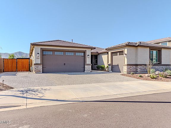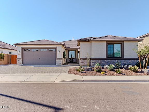 Elegant single story floor plan with amazing views of the White Tank foothills. Interior upgrades; Tile floors throughout entire house, expanded gourmet kitchen with upgraded appliances, refrigerator, under cabinet lights and pot filler over stove, central vacuum system, ceiling fans with lights in all bedrooms and den/office, water softener, reverse osmosis, dual shower heads in master bath, built in sink and upper cabinets in laundry room, man doors both garages, EV charging plug in garage. Exterior upgrades; Custom natural gas heated pool with raised hot tub, large Baja step and water feature, 4K solid aluminum cantilever pergola with insulated roof, ceiling fan and lights, gourmet outdoor kitchen with natural gas 36'' BBQ, dual burner cook top and 16'' pizza oven... travertine hard surfaces throughout entire backyard, Aero-