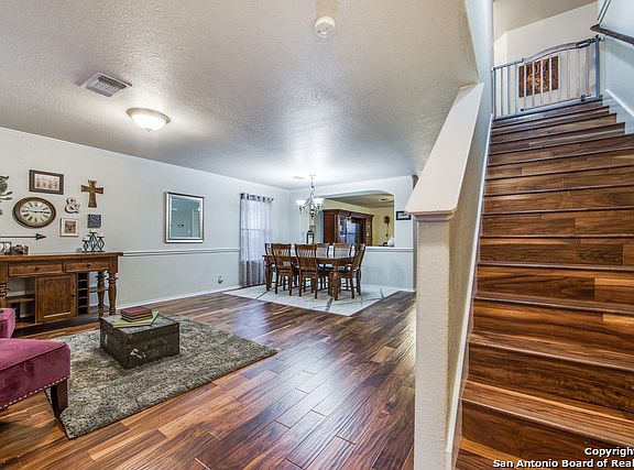 Beautiful home with gorgeous hardwood floors in living room, dining room and staircase. Open floor plan concept, spacious rooms, kitchen includes island and breakfast area, tile floors and back splash plus a breakfast bar. Three living areas with space for everyone. Over-sized master bedroom with two closets, separate garden tub and shower, dual vanity. Deck off back of home leads to private yard with greenbelt. Great location near Randolph AFB, Ft Sam Houston, Forum, restaurants and shopping.