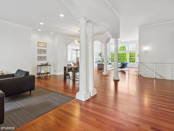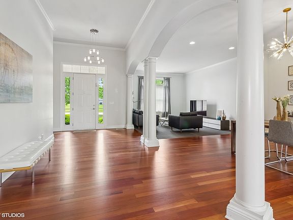 Welcome to a stunning and impeccably maintained sprawling ranch with an amazing open floor plan. Enter the home and you are greeted by an expansive space that truly encompasses fully integrated living. The rooms include a living room, dining room, family room, kitchen, sunroom, laundry room, and bathrooms. The floors of the main space are highlighted by Brazilian cherry floors, floor to ceiling pillars, high ceilings, crown molding, large windows that bring in the natural light, and a private wing for the various bedrooms. The very large private primary bedroom is highlighted by an adjacent sitting room currently used as an office and its own large bathroom with all the amenities, and a walk in closet . The island kitchen is equipped with stainless steel appliances, extensive cabinetry, quartz counter tops, plus a nook desk area. The English full daylight basement almost mirrors the amount of previously mentioned space. The various rooms include a large private office, general open space for entertainment, physical fitness, plus another bedroom with a walk in closet, and a storage room. The home has a three car garage, a maintenance free wraparound deck, professionally designed patio- with a hut tub, open fire place, automatic sprinkling system, a professionally landscaped yard, and full house security system with cameras. All this on a cul-de-sac street and adjacent to a walking path along a wooded preserve. Hurry !!!