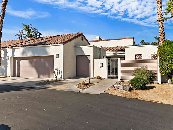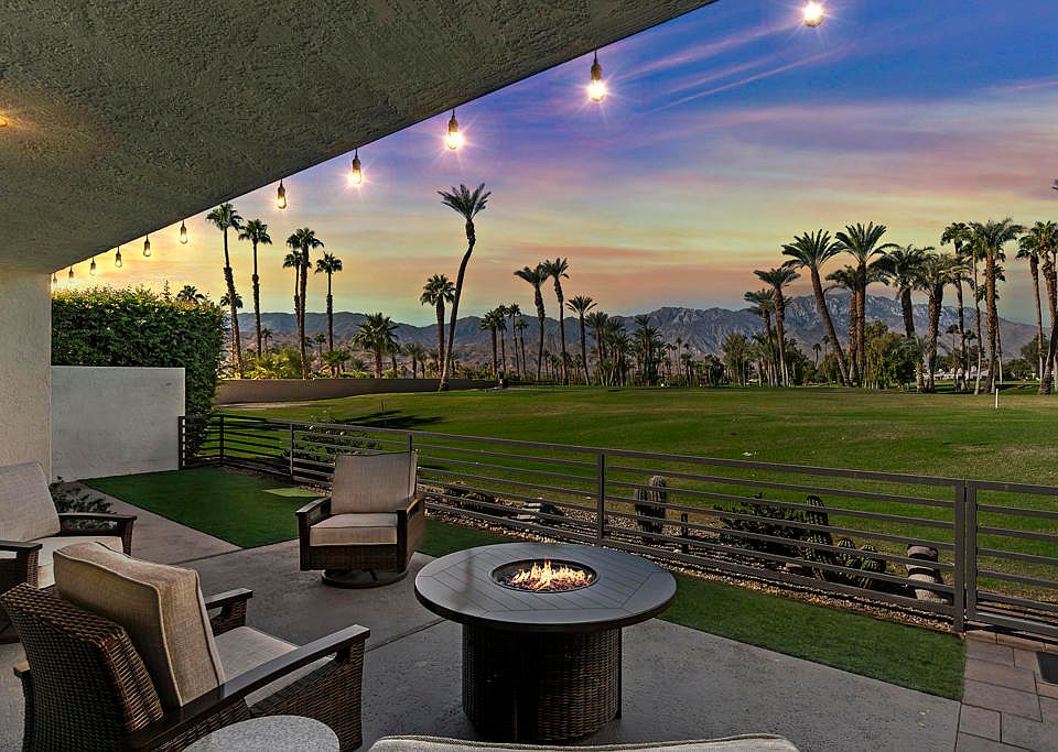 Experience stunning views on the famed Dinah Shore Tournament Course, framed by the majestic San Jacinto mountains. This 2,227 sq. ft. home offers 3 spacious bedrooms and 3 bathrooms, ideal for comfort and privacy. As you enter, you're welcomed by the living room complete with a gorgeous view of the 14th hole, a wet bar and cozy fireplace.Entertain family and friends on the expanded patio, featuring a custom retractable awning. The home also boasts a full 2-car attached garage, plus golf cart space with an epoxy floor finish. There is plenty of storage space with an abundance of cabinets, a wine closet and a large laundry room. Notable features include solar panels, new dual-pane windows and doors, and a whole-house water filtration system. Fully furnished and move-in ready, it's perfect for immediate enjoyment. Conveniently located this property is a must-see. Embrace the charm of Mission Hills Country Club! The HOA covers roof, common area landscaping, community pools, exterior painting, 24-hour gated security, premium cable/internet, insurance for exterior wall and common structure and exterior flood coverage.