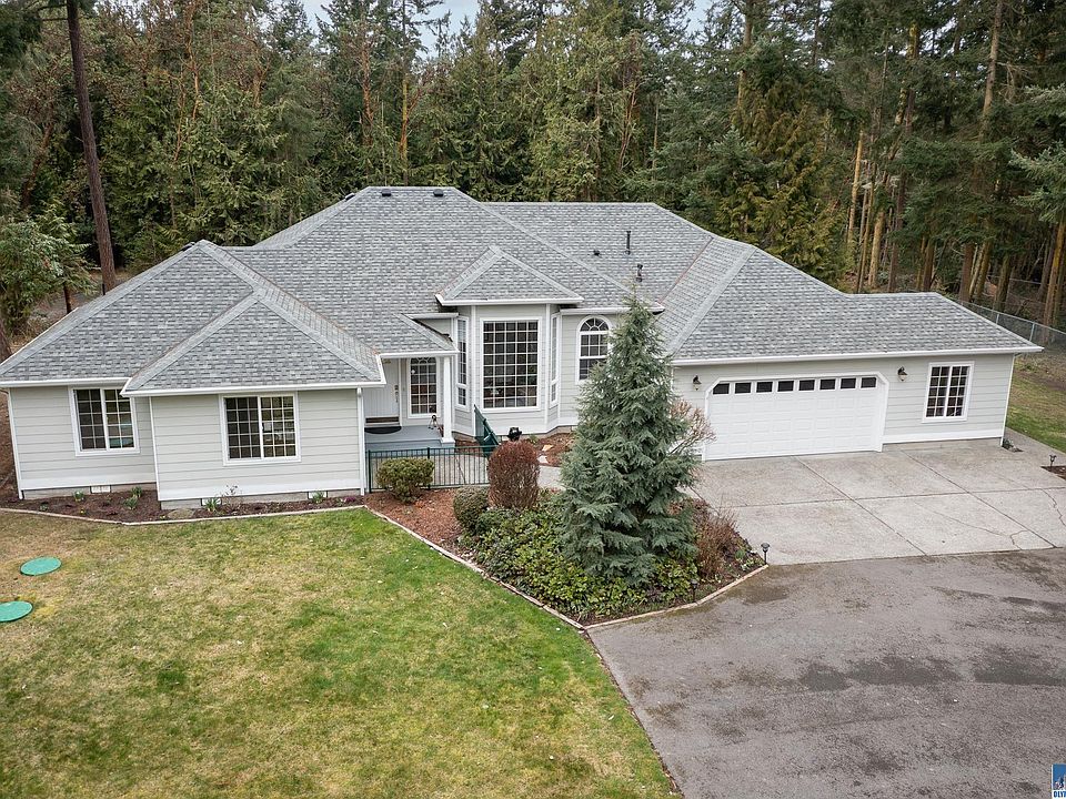 Traditional style home PLUS studio Guest Cottage on nearly 3 serene acres. Enjoy convenience of separate, pvt spaces for guests/extended family in addition to light-filled living spaces, cozy primary suite in main home. Hardwood floors, high ceilings, crown molding, lg windows & options for living/dining configuration in a modern, split floorplan. Ample deck opens up to acreage w/ perfect combo sun exposure & wooded areas - known to be active Eagle habitat! Huge dog run, 3-car att garage spaces and more...!