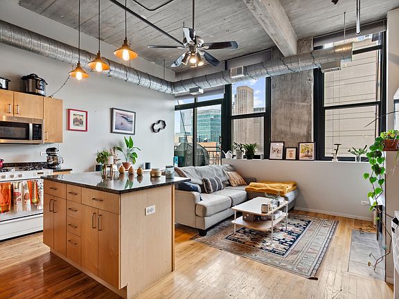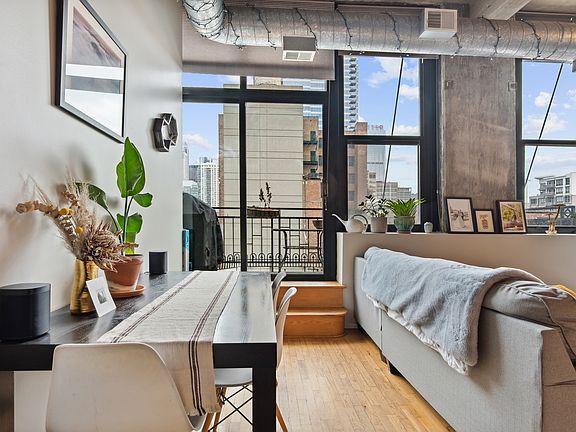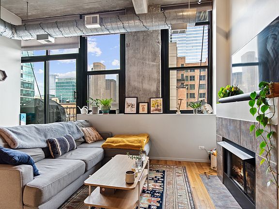 Location Location Location. This preferred east facing 1 bed/1 bath plus den loft features wonderful city views, granite counter-tops, maple cabinets, hardwood floors, 12' concrete ceilings, a gas fireplace, exposed duct work, tons of great natural light, private balcony with city views off living room and in unit washer/ dryer. 1 Garage parking included in the price. This is a great opportunity to live in the Olympia Lofts just steps from Restaurant row on Randolph St, Mary Bartleme Park, Mariano's, Whole Foods, highways, and public transportation and so much that the West Loop offers.