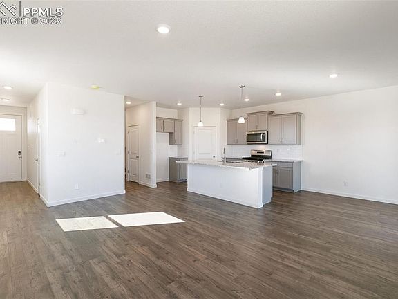 This impressive 2 story, 2156 sq ft home backs to the amazing neighborhood park. The exterior of the home features a blend of classic and modern architectural elements, with a welcoming front porch leading to an impressive 8 foot door at the entry. The centerpiece of the home is the oversized great room area, perfect for everyday living for the household and/or entertaining guests, flows seamlessly into a large and modern kitchen complete with an island and features stainless steel appliances, granite countertops, full backsplash, and a sink facing a large window overlooking the backyard and park. The upper level offers 3 good sized secondary bedrooms with generous closet space and a bathroom with double vanities and quartz countertops with plenty of counterspace. Experience the luxurious primary bedroom which offers plenty of space, a large bath area featuring a large relaxing shower, double vanities with quartz countertops, and 2 large closets including a walk-in. This home comes with AC, tankless water heater, smart home package, front yard landscaping with automated sprinklers, rear yard fencing, and more. Come see this home located in Fountain/Fort Carson school district 8. It is perfect for those looking for space, style, and a prime location!