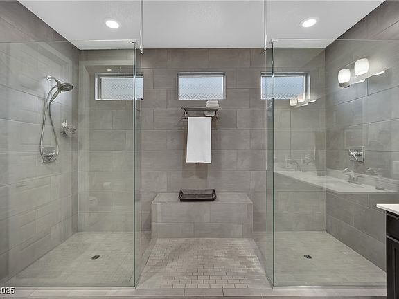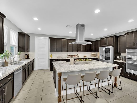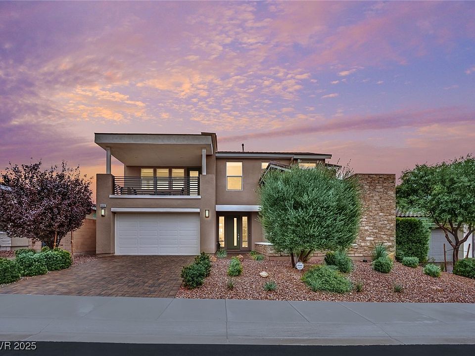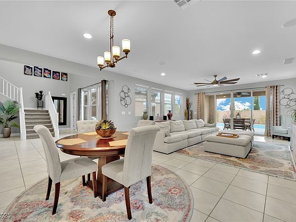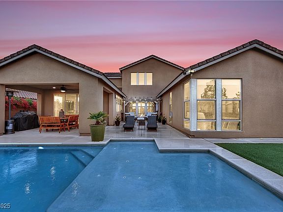 PRICED TO SELL, this stunning Skye Canyon home has LUXURY pool views greet you the moment you walk in. High ceilings & Low-E windows fill the home with natural light. 360° mountain views! A backyard paradise includes heated SALTWATER pool with built-in cleaning system, COVERED PATIO & GAZEBO area. GOURMET KITCHEN features abundant counter space, an enormous island with breakfast bar, chef’s cooktop & hood vent, & spacious pantry, plus oven AND convection oven. MASSIVE Great Room includes in-ceiling 7.1 surround sound. Spacious primary Bedroom boasts dual luxury showers, custom barn door, & walk-in closet. Downstairs GUEST SUITE doubles as a second primary bedroom perfect for guests or multigenerational living. 2 additional upstairs bedrooms & ENCLOSED DEN w/ BALCONY and views. Walk-in closets in 3 of 4 bedrooms. 220V Outlet in garage. Skye Canyon amenities include roaming security, gym, pickleball, pool & more! Recently installed Washer, Dryer, Refrigerator, & Dishwasher included.