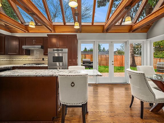 Dramatic kitchen and diningOpen-beam ceilingsDouble ovensFull-length skylightsGranite countertopsAbundant shaker-style cabinetryWet-bar and buffet