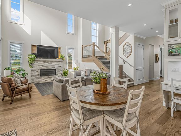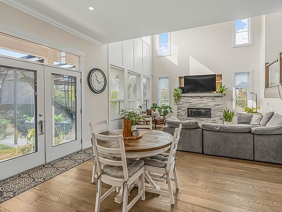 Chef-inspired kitchenQuartz countertopsBlack stainless appliancesWall ovenGas rangeDramatic vaulted great roomExpansive windows