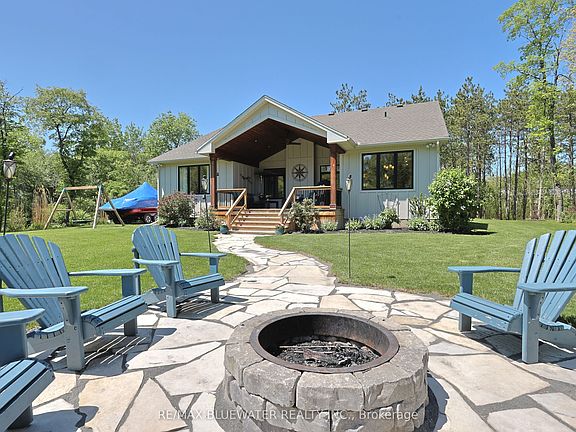 Custom built modern bungalow on a one acre lot surrounded by nature near the Pinery Provincial Park. Drive through the tree lined driveway and your greeted with your new home built in 2021 by Nicholson Builders. Great curb appeal with the landscaped gardens and flagstone walkway leading to the covered front entrance and front porch seating area. Inside, you have a 1742 sqft open concept design with well appointed finishes and flowing with natural light featuring engineered hardwood floors throughout the main floor. Step inside the front foyer and you feel the warmth of the space that invites you in and makes you feel at home. As you enter the living room you will notice the coffered ceilings above and a stone feature wall around the gas fireplace. The kitchen features quartz countertops on two tone cabinetry, large island with waterfall countertop edges, herringbone patterned tile backsplash and stainless steel appliances. Spacious eating area off the kitchen and living room with large windows overlooking the back yard and access to the covered deck. Main floor primary bedroom suite with walk in closet and beautiful ensuite that includes a double vanity and tile shower. The main floor also includes his and her separate offices that border the front foyer overlooking the front entrance or easily include a guest room on the main floor as both offices have full closets. There's an additional full bathroom off the main living space and a mudroom with laundry as you enter from the 22'x24' double car garage. Full finished basement with large family room that features and electric fireplace, 3 bedrooms for kids and guests or crafts, full bathroom, workshop for the handy person and lots of storage in the utility room. Entertain friends in your private back yard as you enjoy the 18' x 14' covered back deck with vaulted ceilings and pot lighting overlooking the tree lined natural setting and flagstone walkway leading to your armour stone firepit. BONUS: GENERAC Generator!