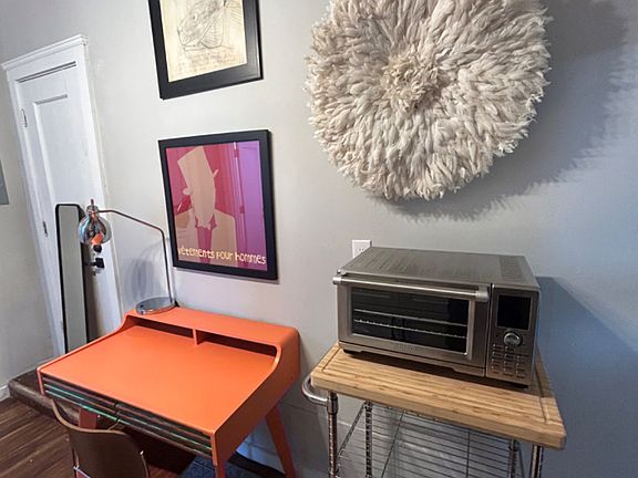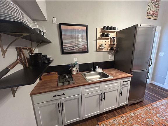 Fresh petite kitchen with a two burner gas stove, modern on-counter convection oven capable of efficiently roasting a full chicken or a batch of cookies!! Full size fridge; Ample closet space.