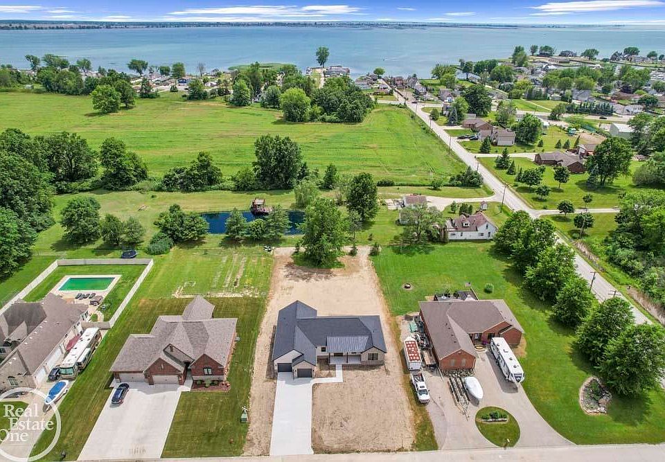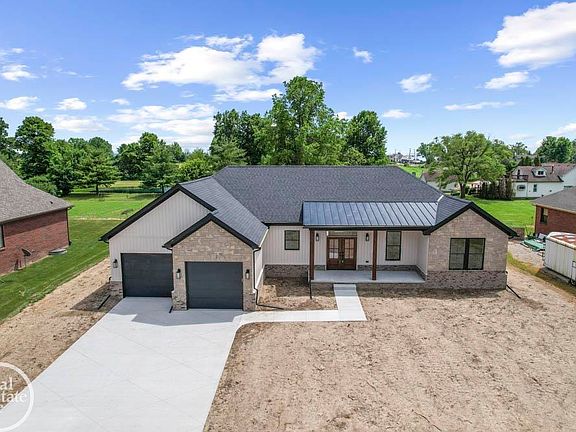 Stunning New Construction Split Ranch From the moment you arrive, you’ll be impressed by the gorgeous stone accents, inviting front porch, elegant double wood doors, and stately columns. Inside, an open and airy floor plan combines elegance and comfort. The chef’s kitchen is a true showstopper—featuring champagne bronze fixtures, cabinets to the ceiling with crown molding, a massive quartz island with sink, ceramic tile backsplash, pot filler at the stove, and abundant soft-close cabinetry. Don’t miss the cleverly concealed walk-in pantry with a “Costco door” to the garage for effortless grocery unloading. The great room is flooded with natural light from large windows and offers soaring ceilings, recessed lighting, a ceiling fan, warm wood floors, and a gas fireplace. Unique 100-year-old antique French doors lead to the primary suite, laundry, and mudroom. The mudroom features a custom cubby, while the laundry boasts porcelain tile floors, quartz counters, a sink, and cabinetry. The primary suite offers recessed lighting, a ceiling fan, and a spa-like bath with quartz counters, dual sinks, porcelain tile flooring, a Euro glass shower, a soaking tub, towel warmer, and an expansive walk-in closet. Two additional bedrooms and a stylish main bath with black-and-gold fixtures are located on the opposite side of the great room. The lower level includes a large basement with egress window, high-efficiency furnace, 50-gallon water heater, and rough-in for a third full bath. Outside, enjoy a spacious backyard with exposed aggregate patio and views of Lake St. Clair. This home is complete and move-in ready—don’t miss your chance to own this exceptional property!
