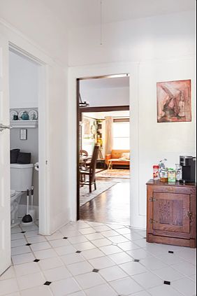 True to its Craftsman style, the large dining room, with its large exposed beams, is open and accessible from the living room and serves as the center piece of the flat. The dining cabinets are the original built-ins, and a large, bottom pull drawer features a rollaway bed that could be pulled out and rolled anywhere in the house. Be sure to check out the date on the old, iron bed wheels!