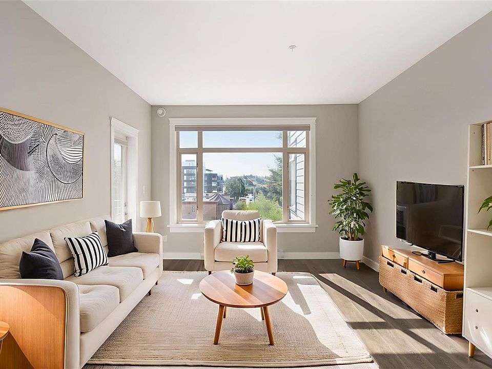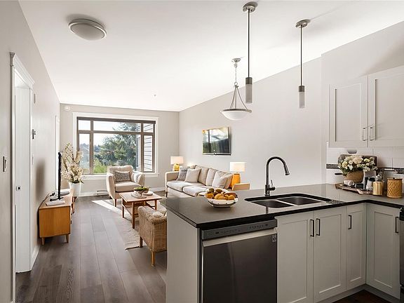 Top-floor, sun-soaked, and centrally located—this 1-bedroom condo in Evo West has it all. Bright and beautifully maintained, the home features 9’ ceilings, a spacious white kitchen with granite countertops and stainless steel appliances, and a sunny living room that opens to a large, private patio perfect for year-round enjoyment. Enjoy the convenience of in-suite laundry, secure parking, and a well-run building. Ideally situated in the heart of downtown Langford, you're just steps from shops, restaurants, and every amenity. A fantastic opportunity to own in one of the Westshore’s most walkable locations.