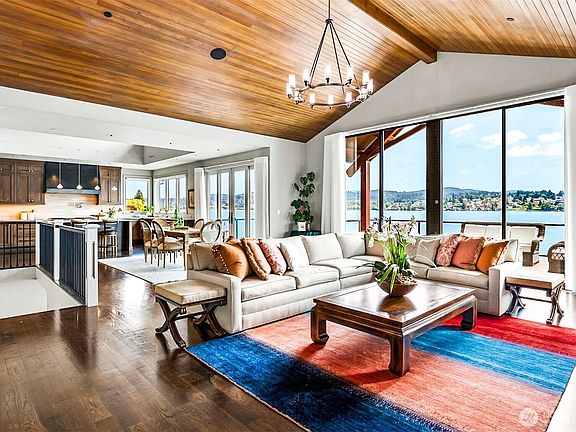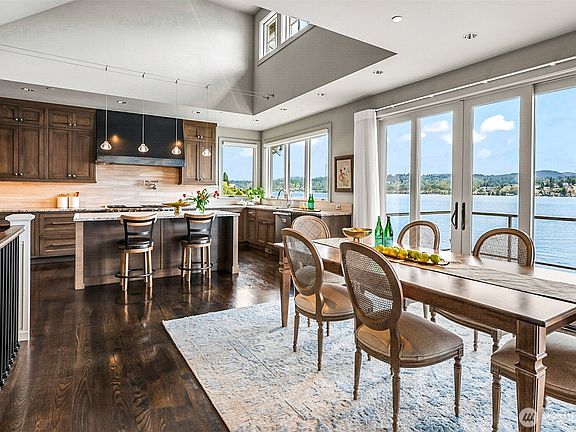 Sophisticated style in Mercer Island waterfront featuring: soaring ceilings, hardwood floors and luxurious finishes. The epicurean kitchen with top line appliances, huge living room with adorable gas fireplace, formal dining area with wet bar. Main floor master with breathtaking Mt.Rainier view balcony, generous walk-in closet and wine tasting room which could be private den or nursing room. Downstairs consists of large rec room, home theater, and 4 additional bedrooms, 3 bathrooms. 2 walk-in Laundry rooms. Fun to watch eagle activities, protected eagle perch nearby. 112' of Lake frontage and a newer dock. New retaining wall and stone work. Huge deck, patio and backyard with fire pit. Walking distance to Beach Club.
