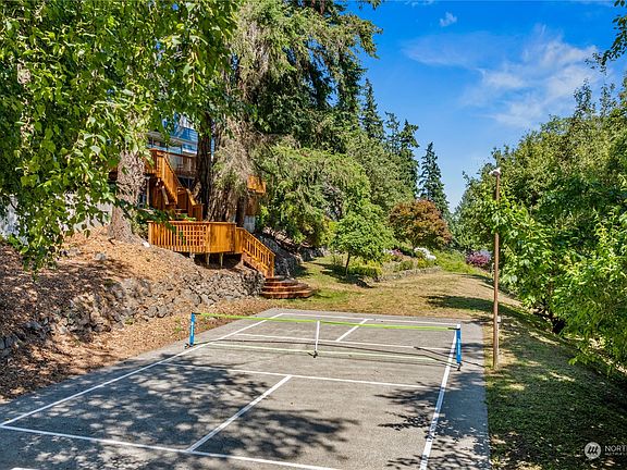 House on the hill with amazing Puget Sound views from all 3 levels in West Port Madison, 13 acre Park across the street. Adjacent to Bloedel Reserve. Giant fireplace, large living room, dining room, study, and deck all with views of the Sound. Large kitchen with access to the garage and laundry room. Master bath w large Copper soaking tub, Mature landscape, 2 water features, spacious Artist Studio basement with new windows connecting with staircase into the Living room. Additional Basement space Gym/Tool Room not included in sq Footage. Large swath of backyard ready for mini farm or continue the naturalization. Circular driveway w 3 car garage. Front yard cut flower garden. Old-school Pickleball Court, Hot Tub, Sauna. Classic NW Living
