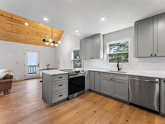 Step into the open kitchen, featuring sleek grey cabinets, stainless steel appliances, and pristine white quartz countertops. The space flows effortlessly into the living area, which boasts wood plank vaulted ceilings, a charming cast iron fireplace, wood flooring, and stylish light fixtures. From here, walk out onto a spacious deck perfect for enjoying the views or entertaining guests.