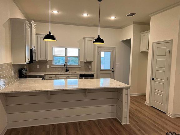 This spacious 4-bedroom, 2-bath home in Tyler ISD offers a great layout with an open kitchen featuring custom cabinets,granite countertops, stainless steel appliances, and pendant lighting. The living area has plenty of natural light and stylishvinyl plank flooring that runs throughout the home. The oversized covered patio is perfect for relaxing or entertaining. Theprimary suite includes crown molding, large windows, a walk-in closet with built-in shelving, and a bathroom with a granitevanity and a large walk-in shower. Three additional bedrooms offer great closet space and share a second full bath with agranite vanity and a tub-shower combo. Located close to shopping, dining, and schools, this home is move-in ready just intime for Fall.
