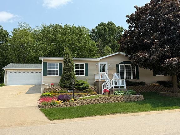 It is all right here!! Split Bedroom floor plan with 3 bedrooms and 2 full baths. Plenty of light with cathedral ceilings and Large 3 season room that walks out onto a shaded Patio and Beautiful Flower Garden. 3 season room also has fireplace so room can be used in winter. All this backs up to Kieselburg Forest Preserve. Completely Private!!. Kitchen boasts of custom built storage inside kitchen cabinets. All new appliances. Large kitchen snack bar. 6 panel doors. Large Master Bedroom Suite with double bowl sinks, whirlpool and large shower in Bath. Skylights in bathrooms and kitchen. Added features are 2nd fireplace in living room, gutter guards and a heated 2 car attached garage. The Lot rent is $755, plus water, sewer, garbage.